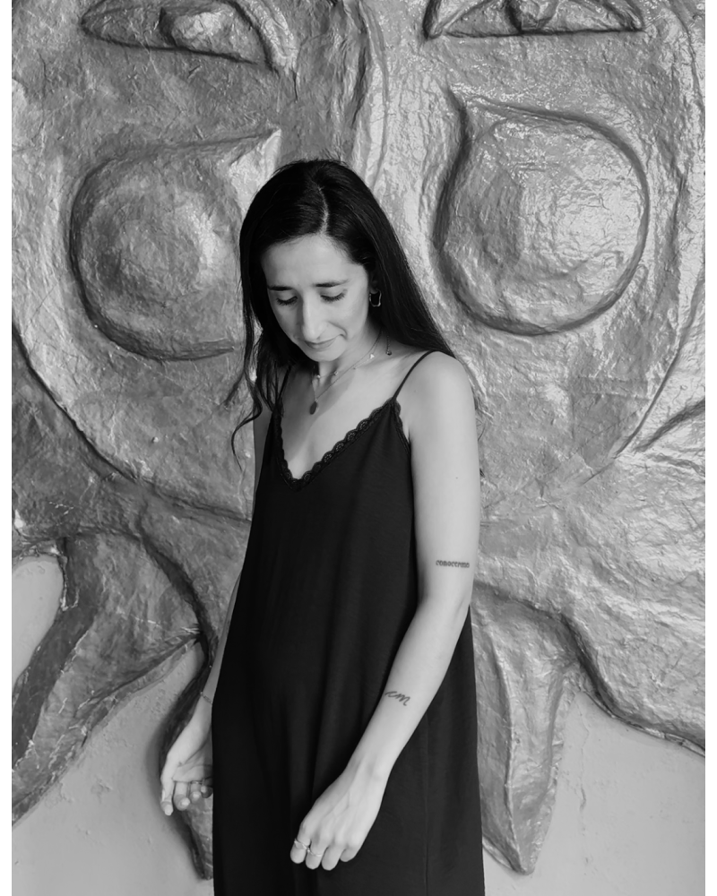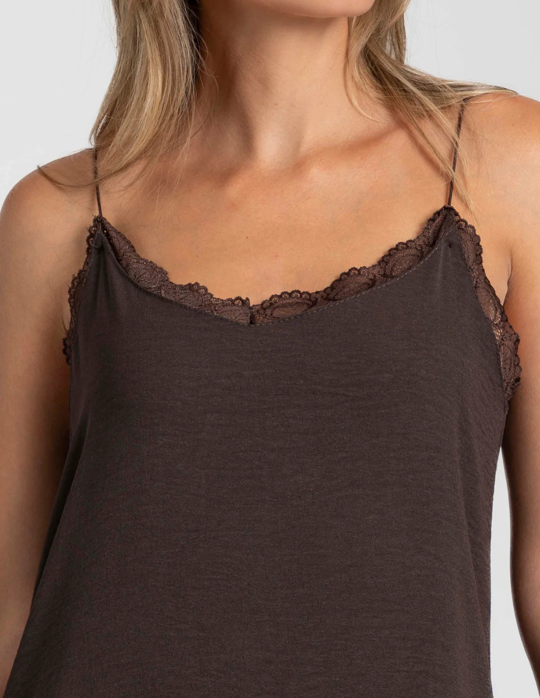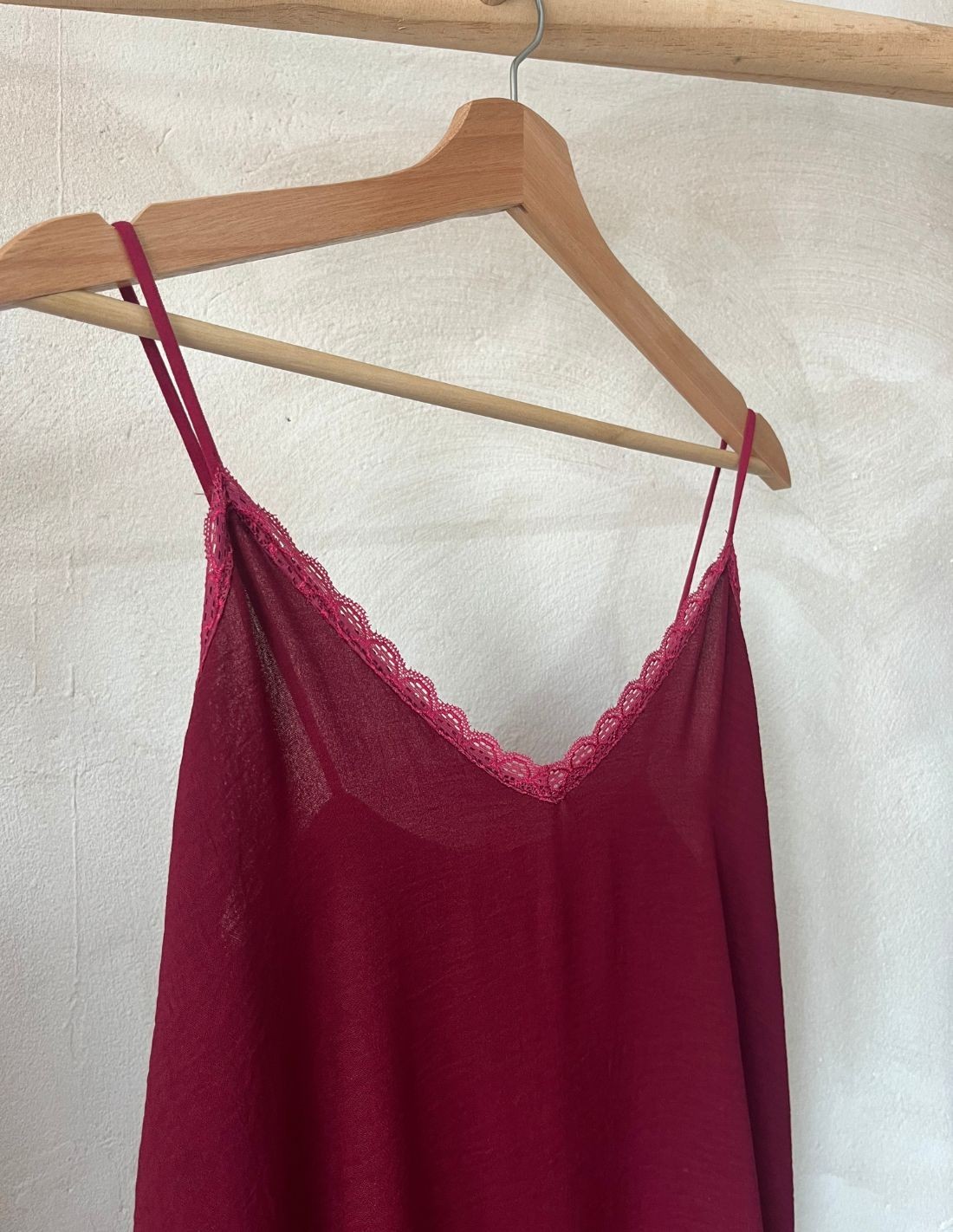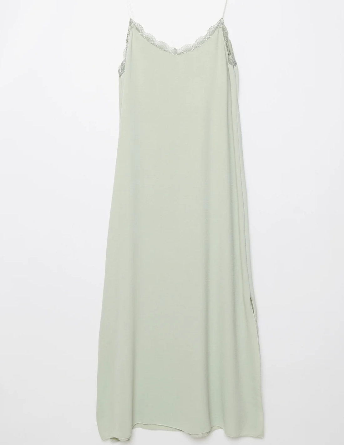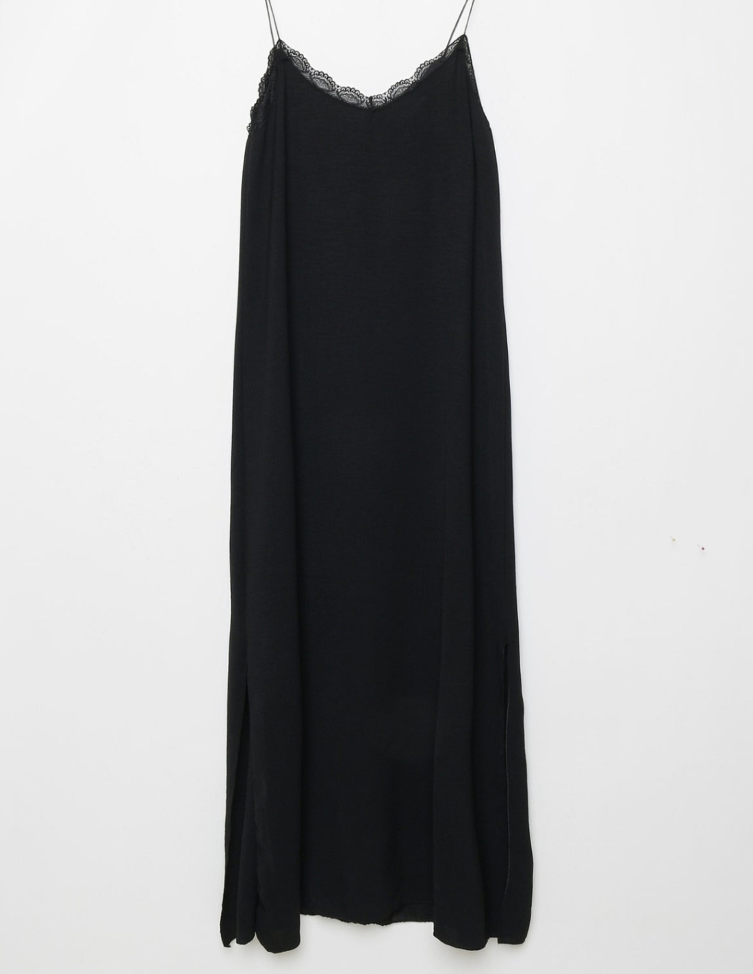 Tejido de gasa. Diseño recto. Diseño lencero. Diseño largo. Escote pico. Tirantes finos. Abertura en el bajo. Detalle encaje.