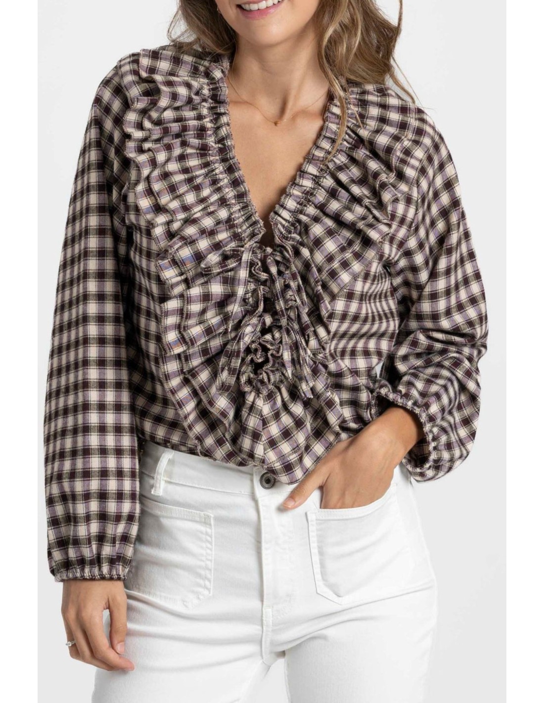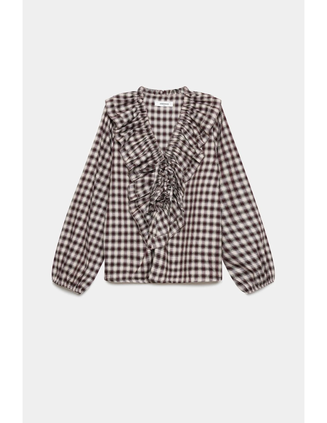 Tejido estampado cuadros. Escote pico. Manga larga. Detalle volantes.