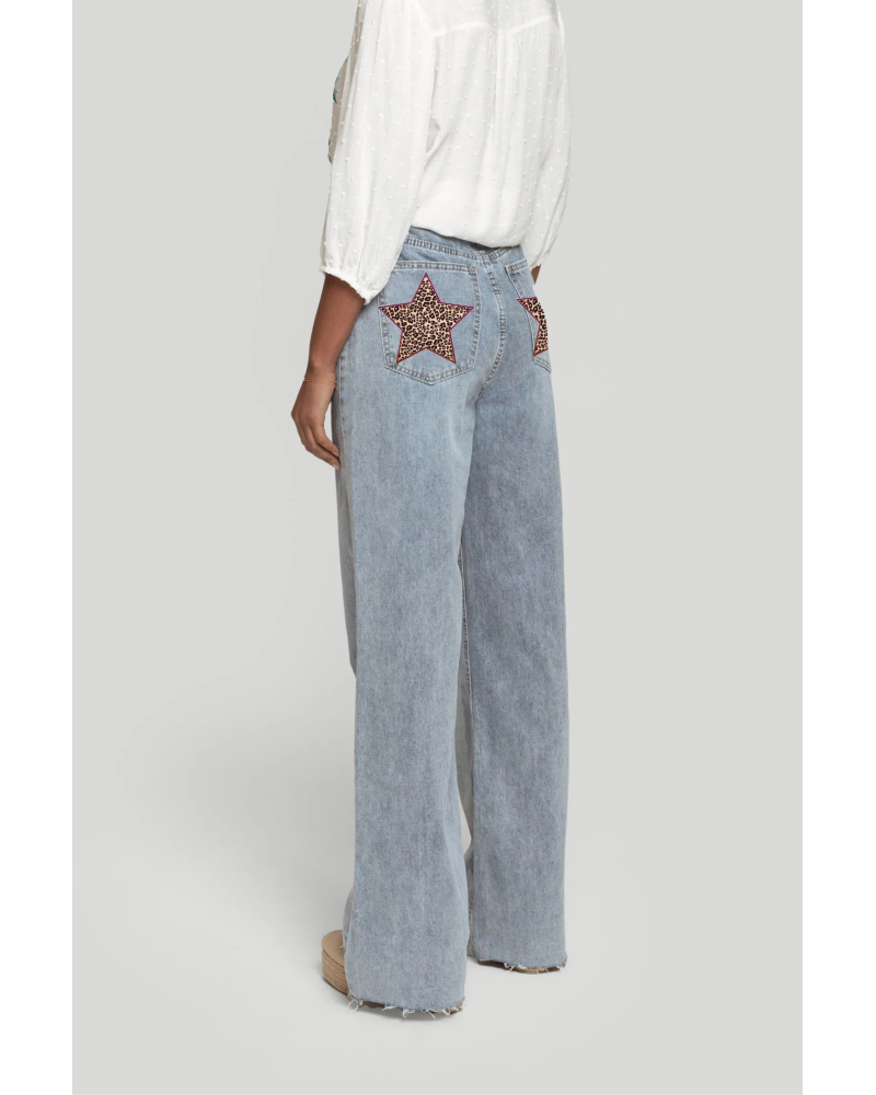 Tejido mezcla de algodón. Perneras anchas. Diseño recto. Largo regularTiro alto. Bajo sin rematar. Detalle estrella diseño propio.