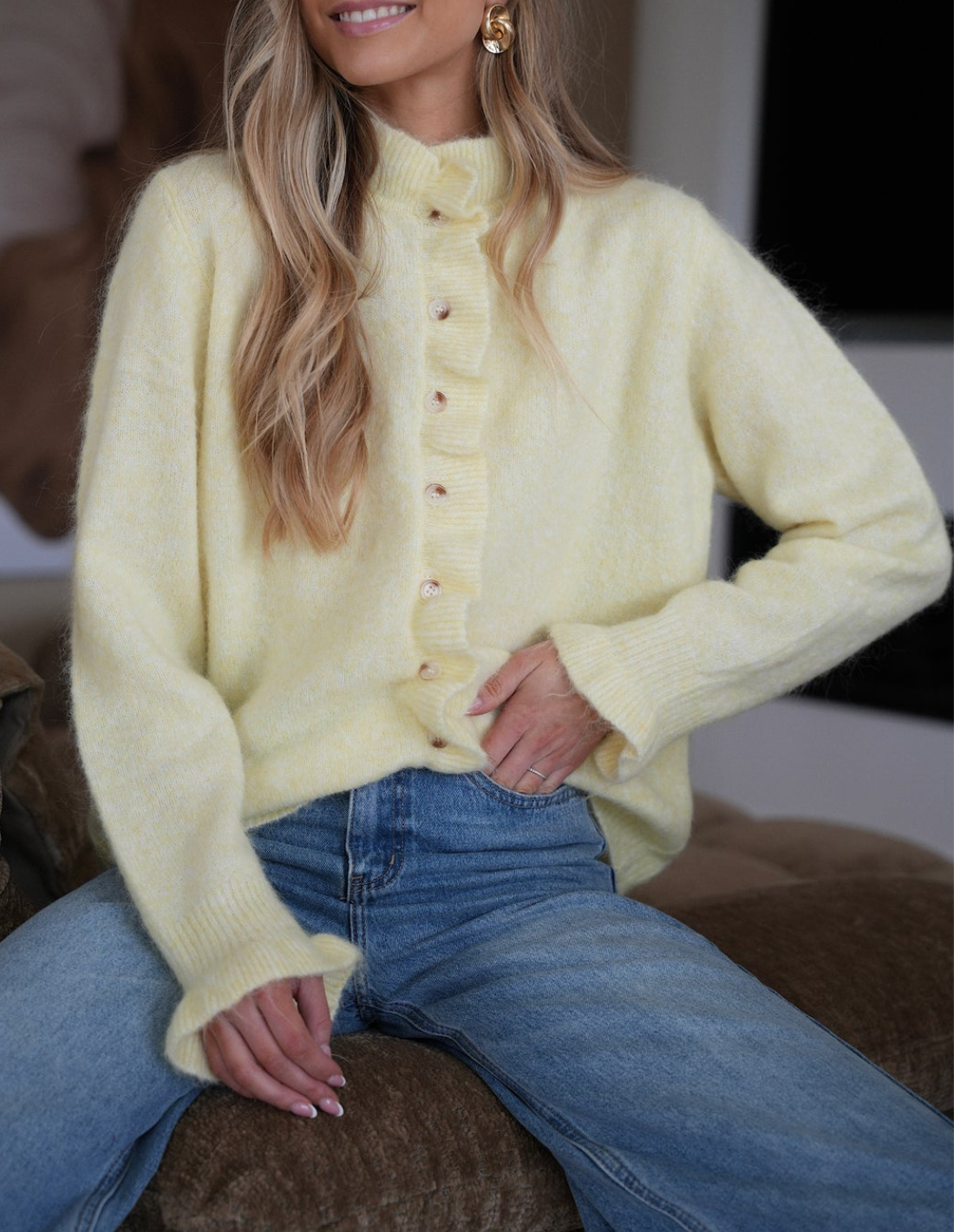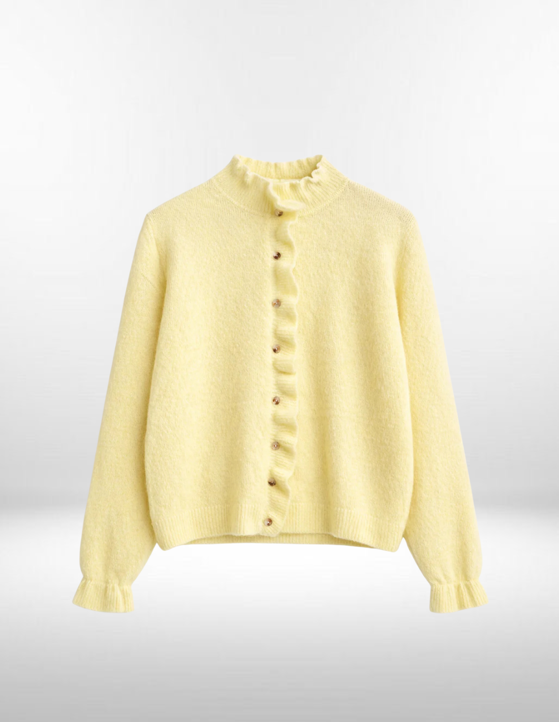 - Detalles volantes en cuello, mangas y botones