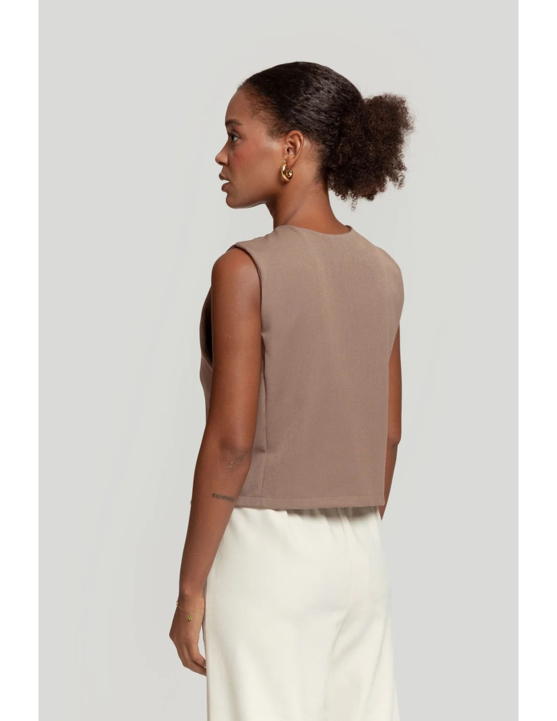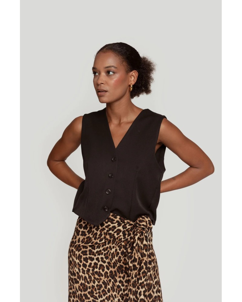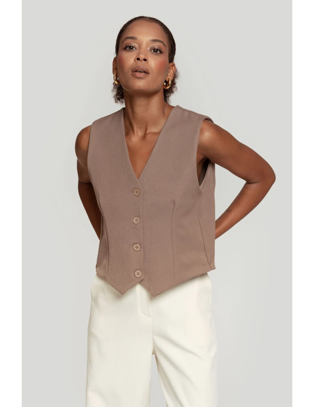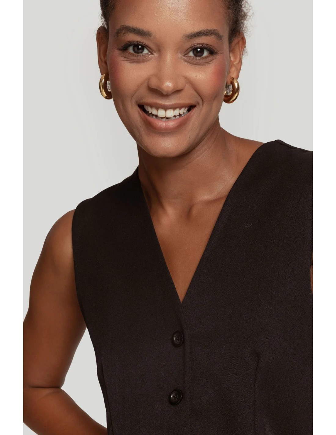 Tejido de acabado suave. Estilo traje. Diseño entallado. Diseño recto. Cuello pico. Cierre de botones. Detalle pinzas.