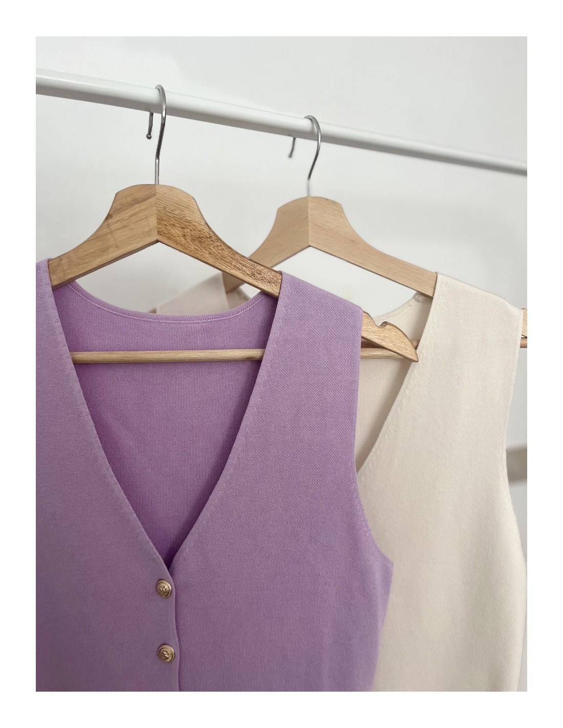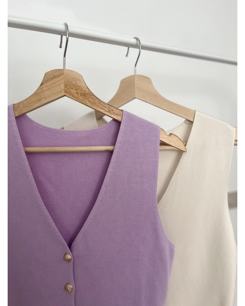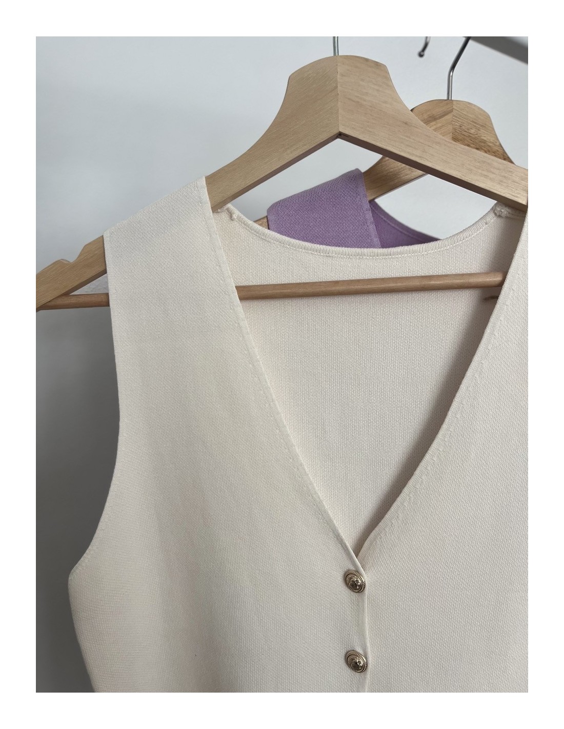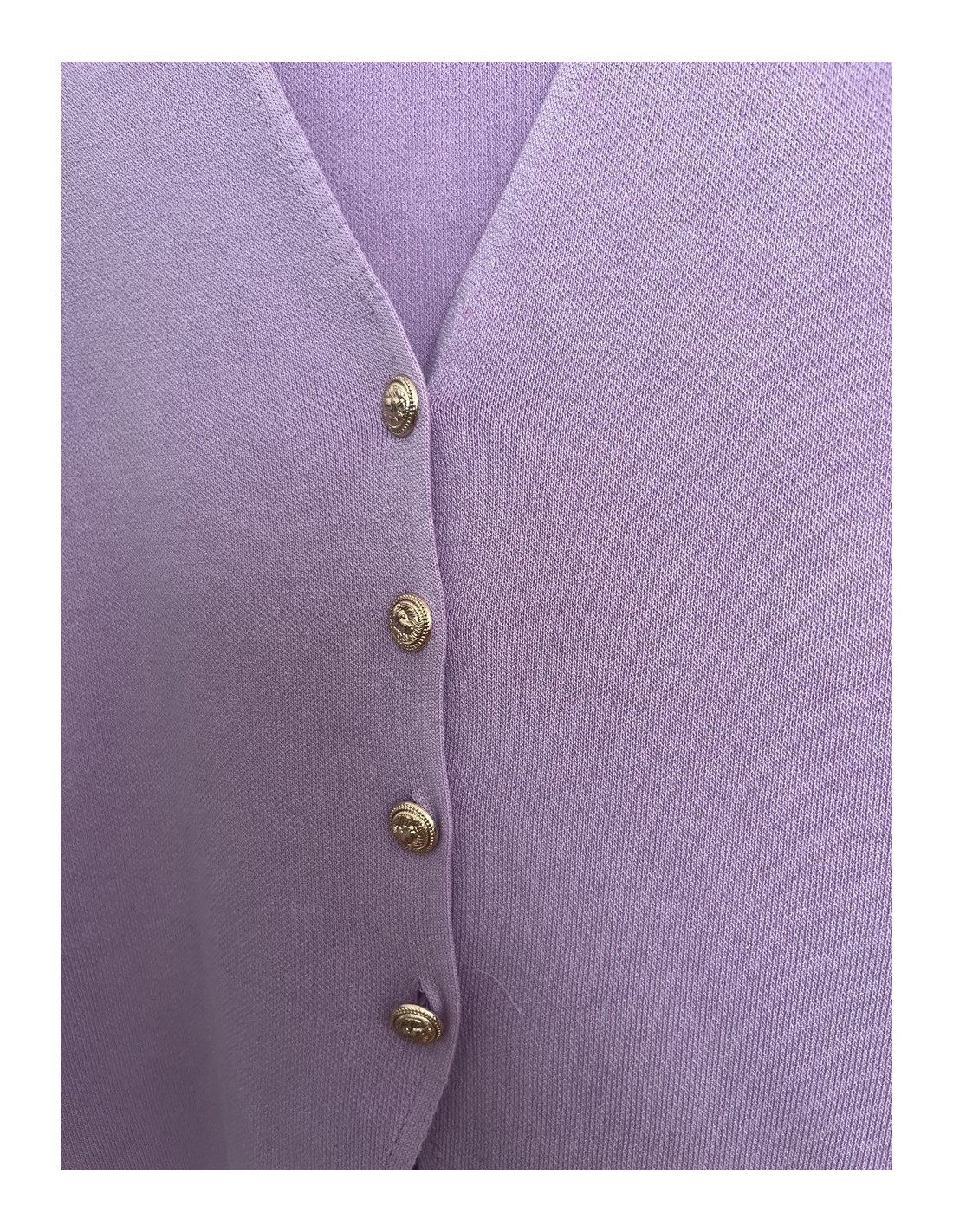 Tejido suave. Diseño recto. Cuello pico. Botones detalle león. Manga sisa.